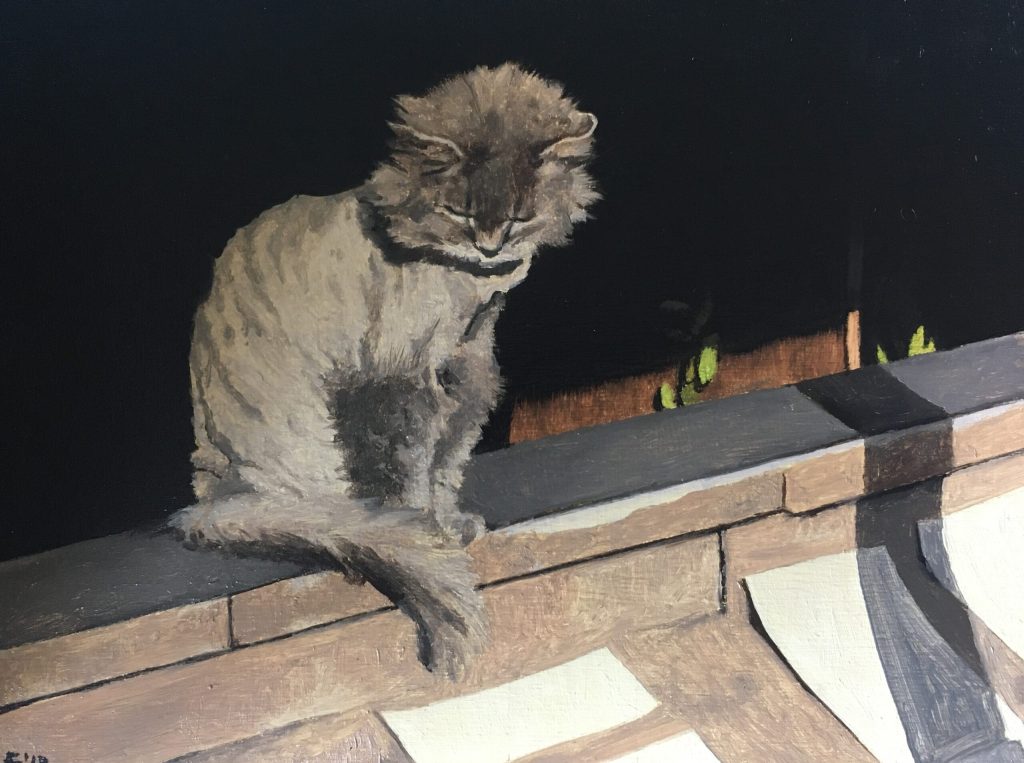 These paintings depict places in Edmonton and other cities that have struck me for one reason or another: colour, lighting, shadow, or particularly beautiful kind of decrepitude. Keeping my eyes peeled for something interesting makes every walk in every city an adventure.